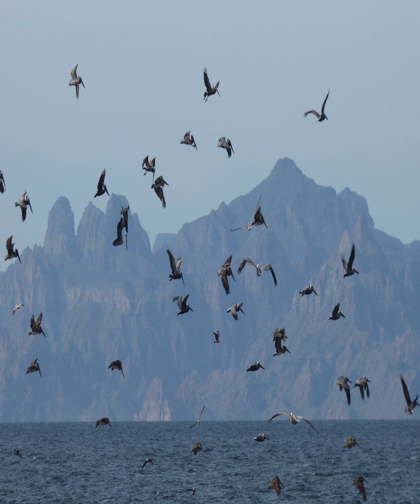 Today we woke up sailing along the picturesque coastline of the Baja peninsula. We had high winds and so while the seas were spicy, spirits were high as we sailed over the ocean. Seeing the waves crashing against the bow is a remarkable sight, and the feeling of exploration was palpable. We had an incredible presentation by our undersea specialist, James Hyde, on the incredibly intricate and fragile topic of plankton. Filled with beautiful videos and a wealth of knowledge, we were moved by the importance of this biodiverse and beautiful part of the dance of the ocean. Closing his presentation, we toasted to an exciting day at sea with bloody marys. One of our bartenders, Derek, served them up in a beautiful style while we lounged and enjoyed the seas. These weeks are so jam-packed with activities that it was a true gift to enjoy some downtime. Our photography instructor, Shayne Sanders, was available in the lounge all day to help with photo transfers and to continue teaching us the tools we have been learning all week to improve our photography skills. This could not have come at a better time, as we were soon treated to a mega pod of common dolphins. To see the ocean alive with dolphins all around the vessel was an unforgettable experience. We all leaned over the bow and watched as dozens of dolphins squeaked and rode the ship’s pressure wave. All this before lunch! We then continued to the entrance of the mouth of Magdalena Bay. We began seeing the blows from gray whales as we entered the calm and protected waters. This was an incredible day that showcased the magic of the Baja coastline.
