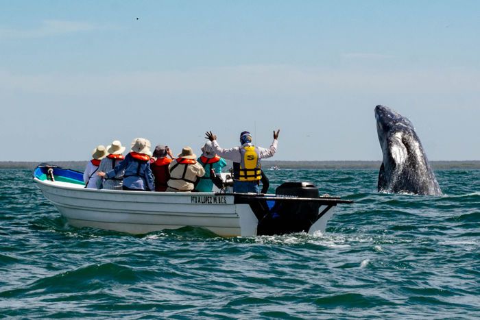 The day dawned clear and sunny, with temperature around 65 ◦F and almost no wind. We made our way north into Hull Canal, picking up our local pilot to guide us through this narrow, navigable channel, observing a multitude of bird species as we wound our way through the mangroves and sand bars. After anchoring just south of the Boca de Soledad, a northern narrow entrance into Magdalena Bay, we enjoyed a presentation by Sofia Merino on gray whales. The afternoon was spent exploring a nearby beautiful sandy beach by bikes or afoot, and connecting with the abundant whales that inhabit the bay.