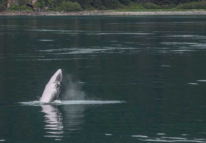After the Minke was through with its exuberant performance, we cruised toward our anchorage in the Inian Islands. The islands have a large population of sea lions that are hauled out on the rocks and fishing for salmon and other fish in the churning waters. Steller sea lions are doing well in Southeast Alaska. Sea otters floated around on their backs among the kelp beds. The healthy giant kelp beds are the ideal habitat for sea otters. Sea lions caught fish within yards of our boat and came to the surface to eat. One even caught a king salmon, which it ate in three big bites. There were at least two dozen eagles sitting in the trees above waiting for a fish to come too close to the water surface.