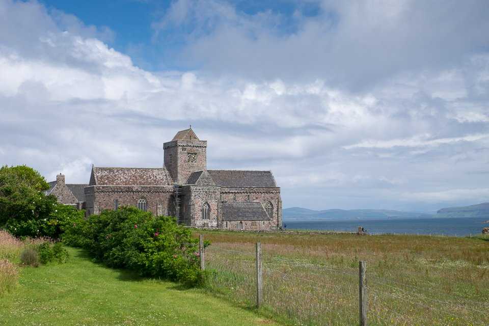 At 7 a.m. we stole away from our berth in Oban and headed off to the Isle of Mull. Soon we were at Craignure and boarding our bus to make our way across the island to Fionnphort, on the southwestern tip of Mull. Here we joined the ferry for the short crossing to Iona. It doesn’t take long to fall under the charm of this tiny island, with its historic buildings sprinkled among delightful cottages, gardens, and crofts where Highland cattle graze contentedly.