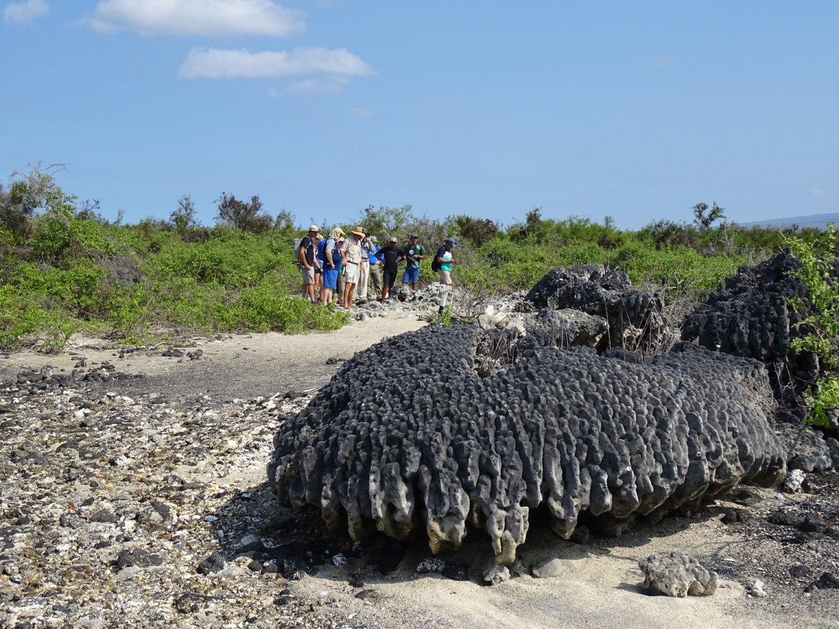 Today our expedition headed toward the two youngest of the Galapagos Islands. With the first beams of sun, early risers tried to find some marine life from the sundeck while we circumnavigated the northern shore of Isabela Island. The gigantic Ecuador and Wolf volcanoes looked spectacular with colorful lava fields reflecting the colors of the sunrise. After breakfast the captain announced our arrival at the equator and we celebrated with a special ceremony, limbo-ing underneath the Ecuadorian flag. That was quite entertaining! After dropping anchor at Punta Vicente Roca, we soon headed on Zodiac rides along the northern coast of Isabela, in search for brown Noddy terns, blue footed boobies, and frigate birds. The sun appeared, warming up this place and marine iguanas did not lose time jumping in the water trying to eat some seaweed. There were also some Galapagos penguins feeding on small black striped Salemas. After the Zodiac ride we decided to go snorkeling. We spotted several varieties of fish, but probably the highlight were the Pacific green turtles gently swimming with us and resting in the bottom of the calm bay. Of course, Galapagos penguins and flightless cormorants delighted our guests, who enjoyed swimming with incredible creatures like nowhere else in the world.