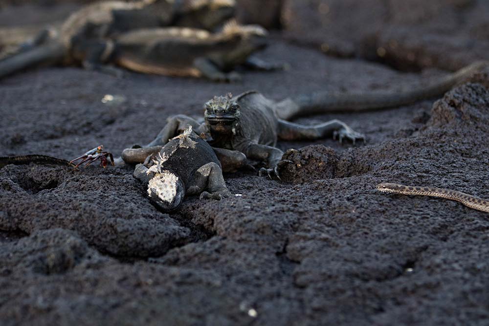 For the afternoon outing we landed on Fernandina Island. This island is the youngest in the region. It is covered by vast lava flows and it is an active volcano whose last eruption took place in April 2009. Fernandina Island has colonies of marine iguanas, cormorants and sea lions. Marine iguanas form large groups along the rocky shore. Our outing on Fernandina was breathtaking! At the moment we landed we spotted our first snake, just like in the documentaries, the snake stalking the baby iguana and the baby iguana keeping a distance from this seasoned predator. At the end we spotted 14 snakes and the end of the story was: baby iguana the winner! Snake, try again next time.