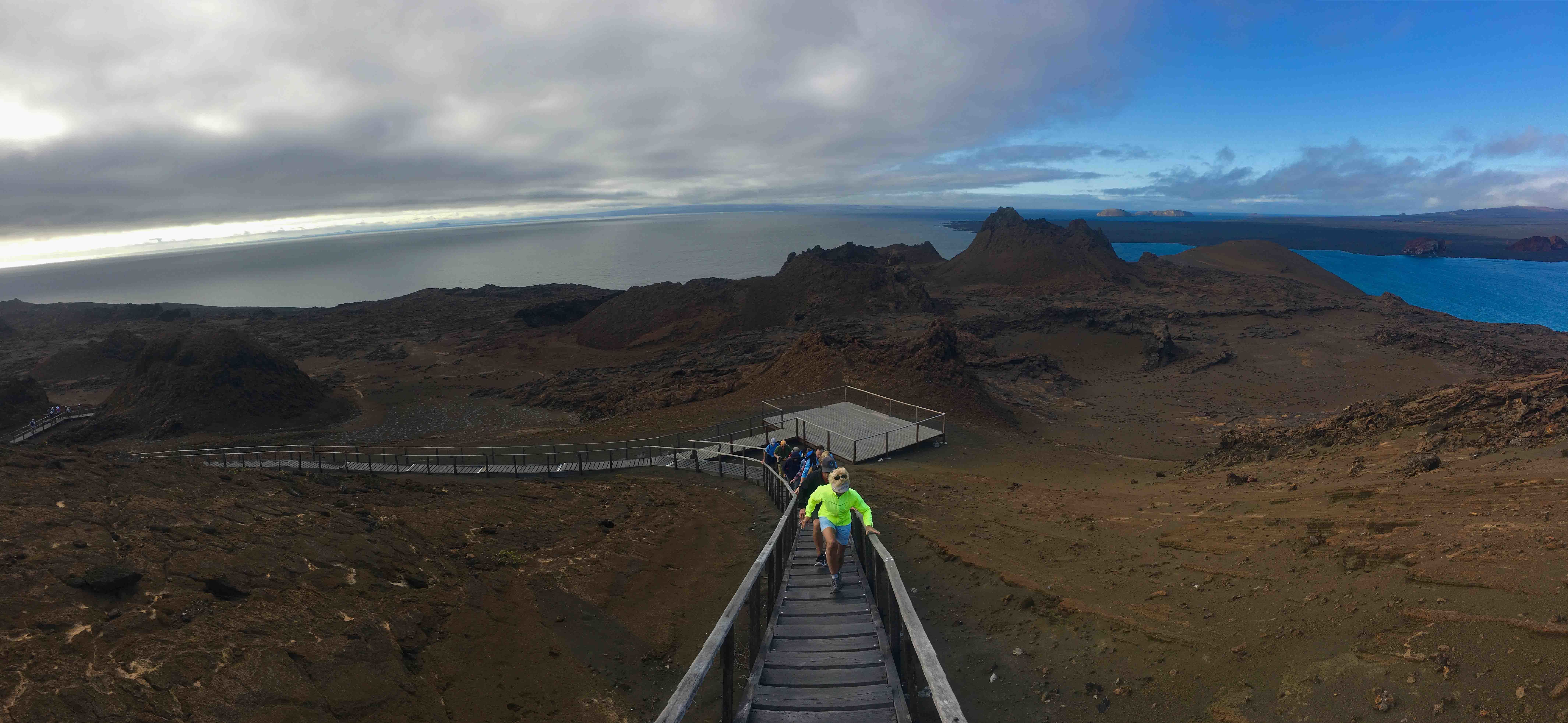 After the hike, we went on a fantastic snorkeling outing, encountering several Pacific green sea turtles, playful sea lion pups, a couple of Galapagos penguins, and a few marine iguanas feeding underwater. This time of the year the water is a bit “refreshing” (69 F) for the equator, allowing for plenty of species of fish to be around coastal areas feeding and interacting among themselves. We spotted several species including colorful ones like the blue-chin parrotfish, and some in big schools such as the yellowtail surgeonfish.