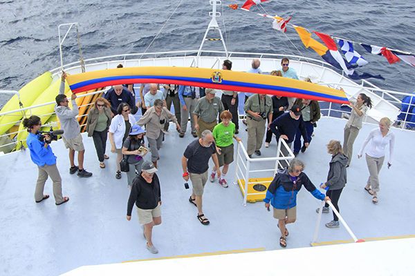 With the ship still moving, we started our day with early cetacean watching. A small group of common dolphins showed up and for most of the trip, we enjoy the landscape and some seabirds along with the traditional crossing of the Equator line. Anchored at Punta Vicente Roca on Isabela, our first outing started with a Zodiac ride to admire the imposing geology and the various animals that live here. We found flightless cormorants, Galapagos penguins, large marine iguanas, and a good number of Pacific green turtles which feed and rest in this area.