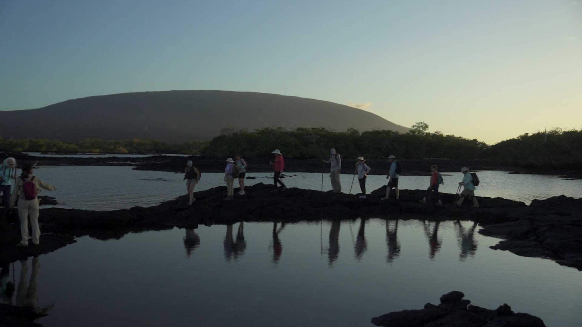 Today we woke up very early to find marine life in the light of the sunrise. Some of us had a stretching session with wellness specialist Estefania. It was very relaxing since we were surrounded by the landscape of the collapsed caldera of the Ecuador Volcano. Right after breakfast, we crossed the equator. We had a gathering on the front deck, and a naturalist carried an Ecuadorian flag as we symbolically crossed the equatorial line.