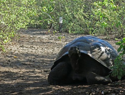 There were two walk options (plus a couple of walk speeds) to choose from this morning. Paul led a fast, long walk and Antonio and Enrique did the long walk at a slower pace with their groups of guests. I took those who wanted the short walk option. Everyone who went out had a wonderful experience! By the time the hikes began the clouds had all blown away, the sun came out and it was HOT. We could tell that it had rained the day before as it was also quite humid. But we enjoyed the hikes and everyone was rewarded with great looks at colorful land iguanas and several giant tortoises. Because these emblematic reptiles were taken by the thousands from the islands in the 1800s and early 1900s, to be used for food by the whalers, sealers and sailors, and for Zoo and scientific collections, they are now mostly found in the highlands of the islands. In just a couple places – and Urbina Bay is one of these – can we find tortoises down near the coast. We were delighted to see several of these ancient animals this morning. We found some really large ones but also saw three youngsters of 15-20 years of age! And needless to say, we took many photographs!