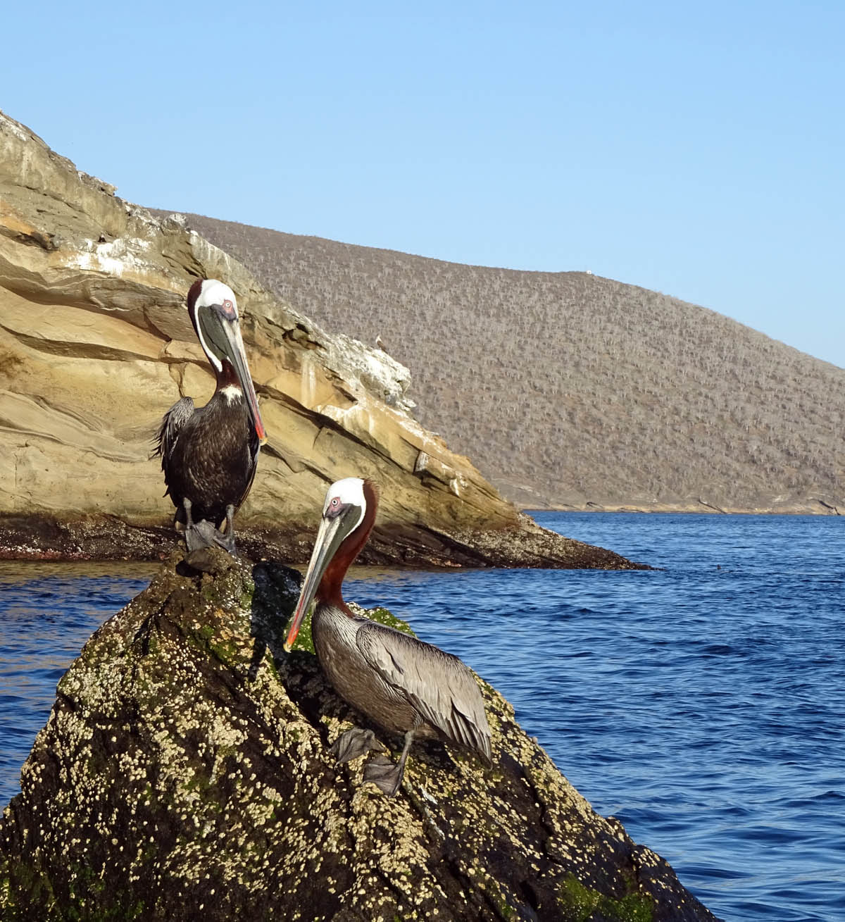 After our walk, everyone returned aboard and started to navigate towards Tagus Cove. As we dropped anchor in the calm waters of this cove, we went kayaking, and snorkeling in this place. Towards the end of the afternoon some of our guests went on an invigorating walk to the top of a crater, there the view of most of the shield volcanoes of Isabela was a big highlight. We also had a Zodiac ride along the coast of this cove; here we observed green sea turtles, Galapagos penguins, nesting brown pelicans and Galapagos marine iguanas while enjoying the last rays of sun.