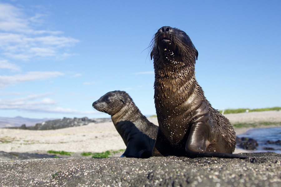 Today we started our day surrounded by enormous shield volcanoes located in the western area of the Galapagos. Our first outing of the day was at Urbina Bay and after landing we started a challenging hike along the rocky coast of this site. During our walk we learned that an unusual event happened in Urbina. A massive uplift of the seabed occurred in 1954 leaving many marine organisms, such as huge coral heads and tubeworms, on land. It was an unbelievable experience to observe how nowadays the coral is surrounded by very dense vegetation that includes yellow cordia trees, poison apple trees, and one of my favorite flowers, the Galapagos cotton flower. On our way along the trail we spotted several Galapagos yellow land iguanas and one giant tortoise from Alcedo volcano. There were many land birds, such as ground finches, flycatchers, and mocking birds singing and flying over the trail. With a hot morning, clear sky, and a great company of our friendly guests, we ended the visit with a refreshing dip in the water at the same beach we disembarked at earlier.