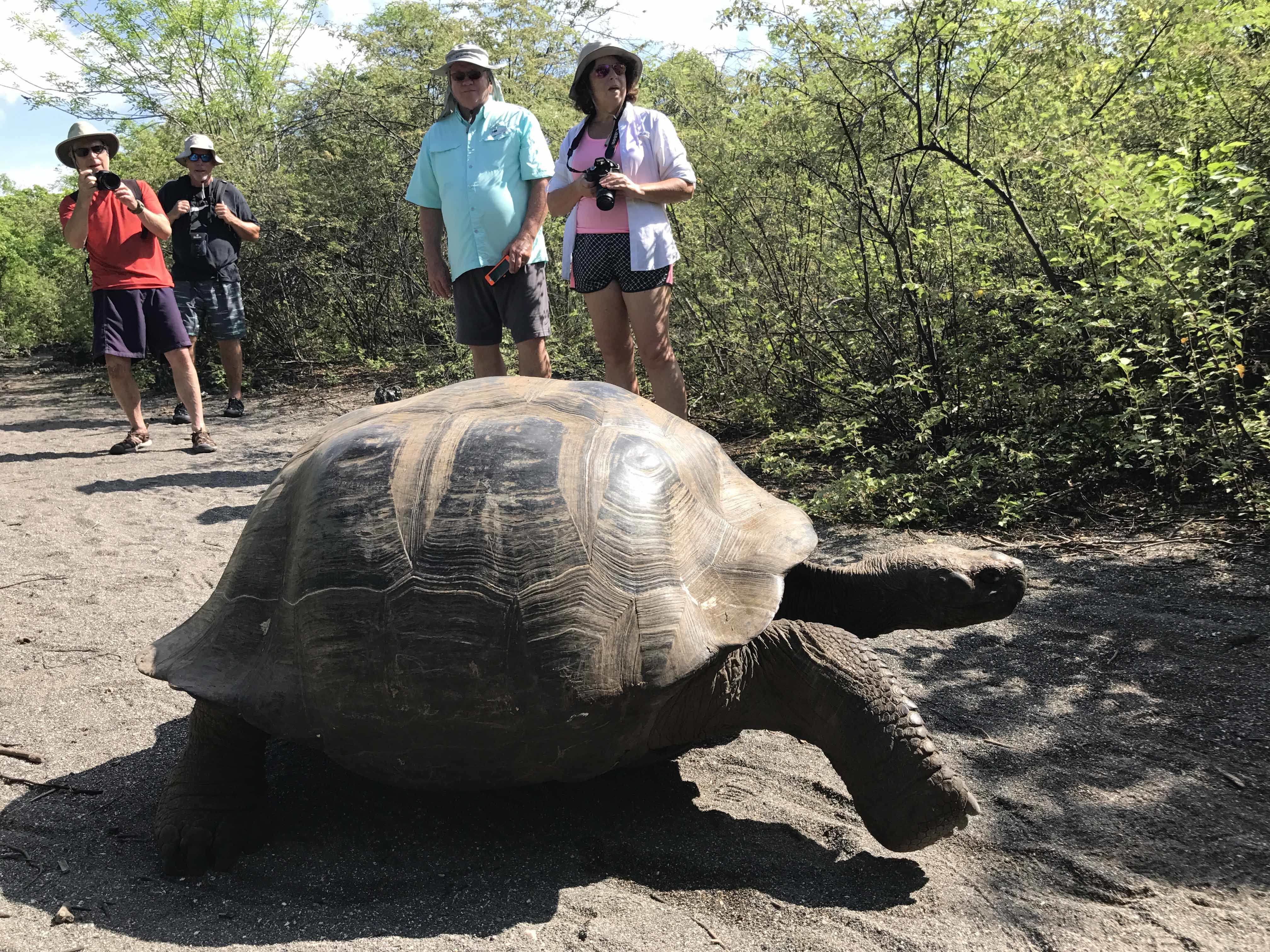 We left our peaceful anchorage off Fernandina at 0500 and navigated east to anchor just before breakfast in Urbina Bay at the base of Volcan Alcedo. This area was uplifted dramatically in either 1953 or 1954 and on our morning hikes we could still see evidence that the ocean once covered the trails where we walked. There were encrustations of tube worms and several large coral heads, all high and dry and slowly disintegrating. What we enjoyed most however this morning were nearly a dozen giant tortoises of all sizes that we were surprised and delighted to find lumbering slowly along the sandy paths among the lush vegetation behind the landing beach. It had apparently rained hard the day before and all the terrestrial critters were on the move! Land iguanas were mating, yellow warblers, finches and mocking birds were singing and the tortoises were on their way somewhere - busily walking, to where? – we did not know!