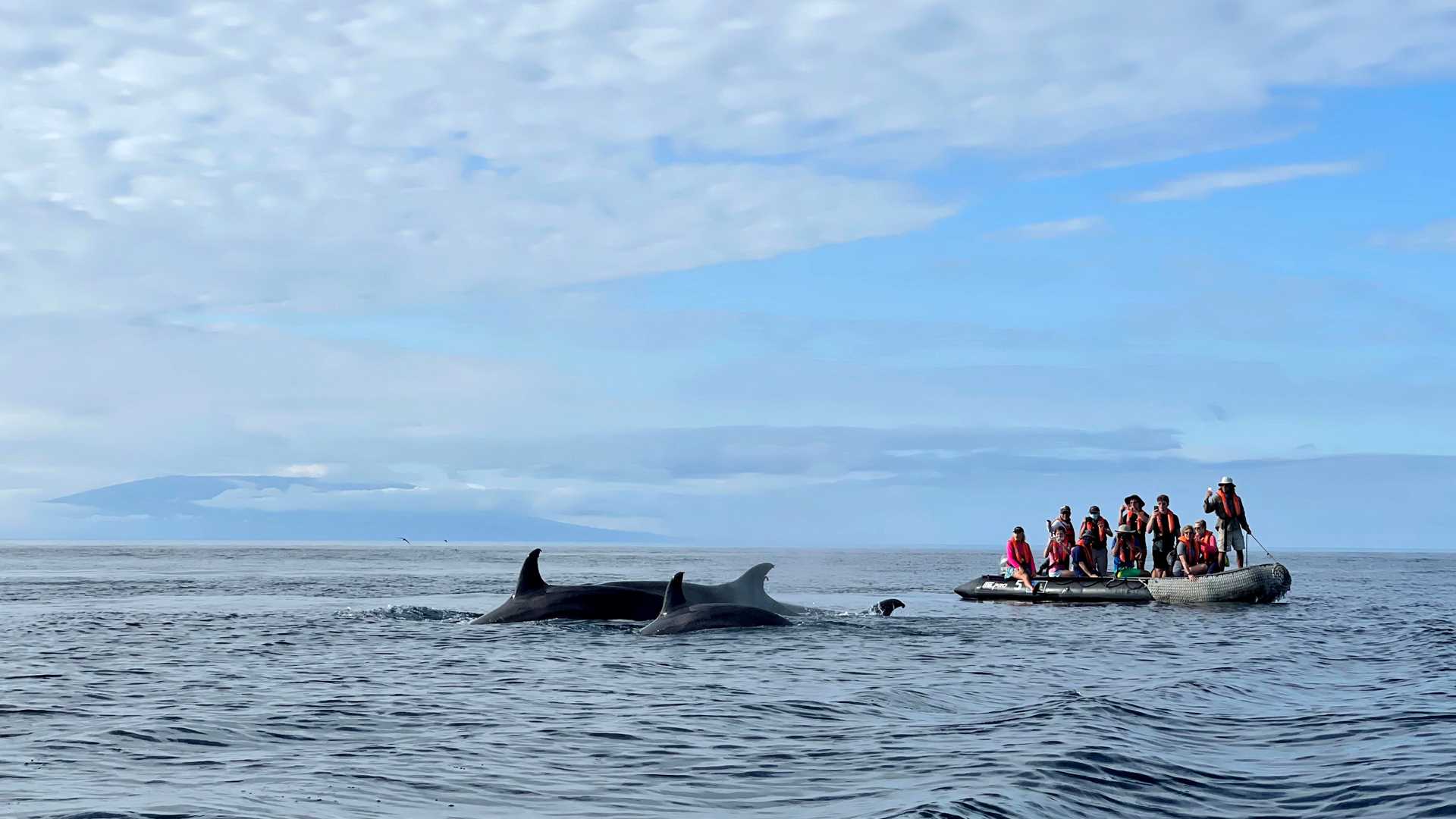 After breakfast, we boarded Zodiacs and headed out to see the orcas more closely. We carefully approached the pod and waited. Our patience paid off, and the pod grew curious and moved closer. One large male, four females and at least two calves came to check us out. The pod spread around the bay, and one by one, they swam very close to our Zodiacs. A few swam belly up, and others jumped high in the air. They gave us an unforgettable experience.