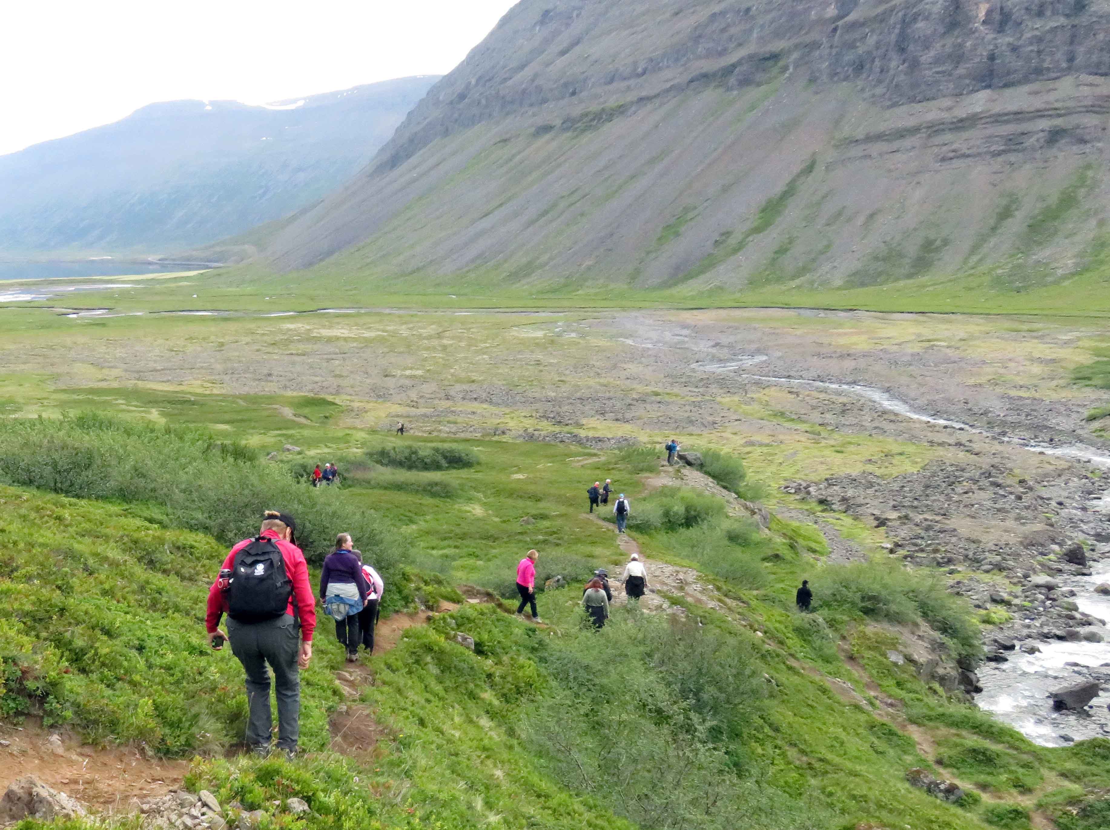 Following an exciting evening with the feisty Arctic Terns of Vigur Island, we remained anchored near this charming island overnight and then sailed for the nearby town of Ísafjörđur. Ísafjörđur is the largest town in the Westfjords and is located on a spit in Skutulsfjörđur, a small branch of Ísafjarđardjup, the largest fjord in the Westfjords. The weather was most agreeable with some clouds, a light breeze, and temperature around 11 degrees C. We were soon off on our morning excursions with the majority of us boarding motor coaches for a drive along the coast to the trailhead for the hike to Valagil.
