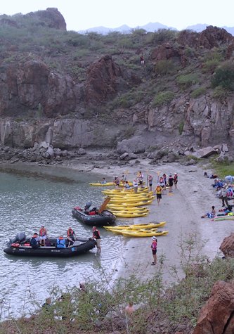 Our landing at Danzante presented many options. We kayaked the calm waters of Honeymoon Cove, paddling about in single or double kayaks. We immersed ourselves in the experience by donning fins, mask and snorkel and joining the denizens of the sea for a short swim. Lastly, we did the “hike of many views.” Danzante is a small island, but it offers sweeping views of the Sierra de la Giganta to the west, Isla del Carmen to the east, and the bowl of Honeymoon Cove to the South.
