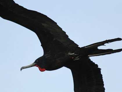 Our last transports for discovery were our expedition landing craft. The southern fringe of San Gabriel has a line of mangroves that hold a rookery of magnificent frigatebirds. We slowly cruised along the mangroves observing the amorous intentioned male frigates sitting in the treetops with their red gular pouches inflated. The failing light of the day bathed all in a sweet rosy glow. We returned to the mother ship National Geographic Sea Bird just as the clouds lit in a parfait rainbow of sunset flavors.