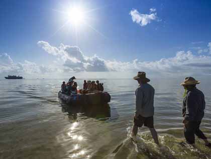 Back onboard by late morning, we gathered in the lounge for introductions to the boat and the staff, while the crew reloaded DIBs and National Geographic Sea Lion got underway to head north. Immediately after lunch we had our first whale sighting—a humpback whale very near the ship. We stayed with it for awhile, tearing ourselves away to press on northward. Some bottlenose dolphins passed us in the distance, on their way to some pressing engagement. What a lovely taste of things to come, we hope. The rest of the afternoon was spent settling into our shipboard home and preparing for the next few days. We napped, relaxed on deck, unpacked, attended presentations about cameras and photography and whales, and then gathered on deck to share in the sunset. At this writing we are on our way to the lounge for a brief recap, and then to dinner. What a beautiful start to our voyage!