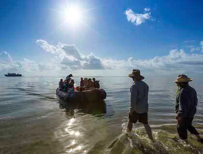 Back onboard by late morning, we gathered in the lounge for introductions to the boat and the staff, while the crew reloaded DIBs and National Geographic Sea Lion got underway to head north. Immediately after lunch we had our first whale sighting—a humpback whale very near the ship. We stayed with it for awhile, tearing ourselves away to press on northward. Some bottlenose dolphins passed us in the distance, on their way to some pressing engagement. What a lovely taste of things to come, we hope. The rest of the afternoon was spent settling into our shipboard home and preparing for the next few days. We napped, relaxed on deck, unpacked, attended presentations about cameras and photography and whales, and then gathered on deck to share in the sunset.  At this writing we are on our way to the lounge for a brief recap, and then to dinner. What a beautiful start to our voyage!