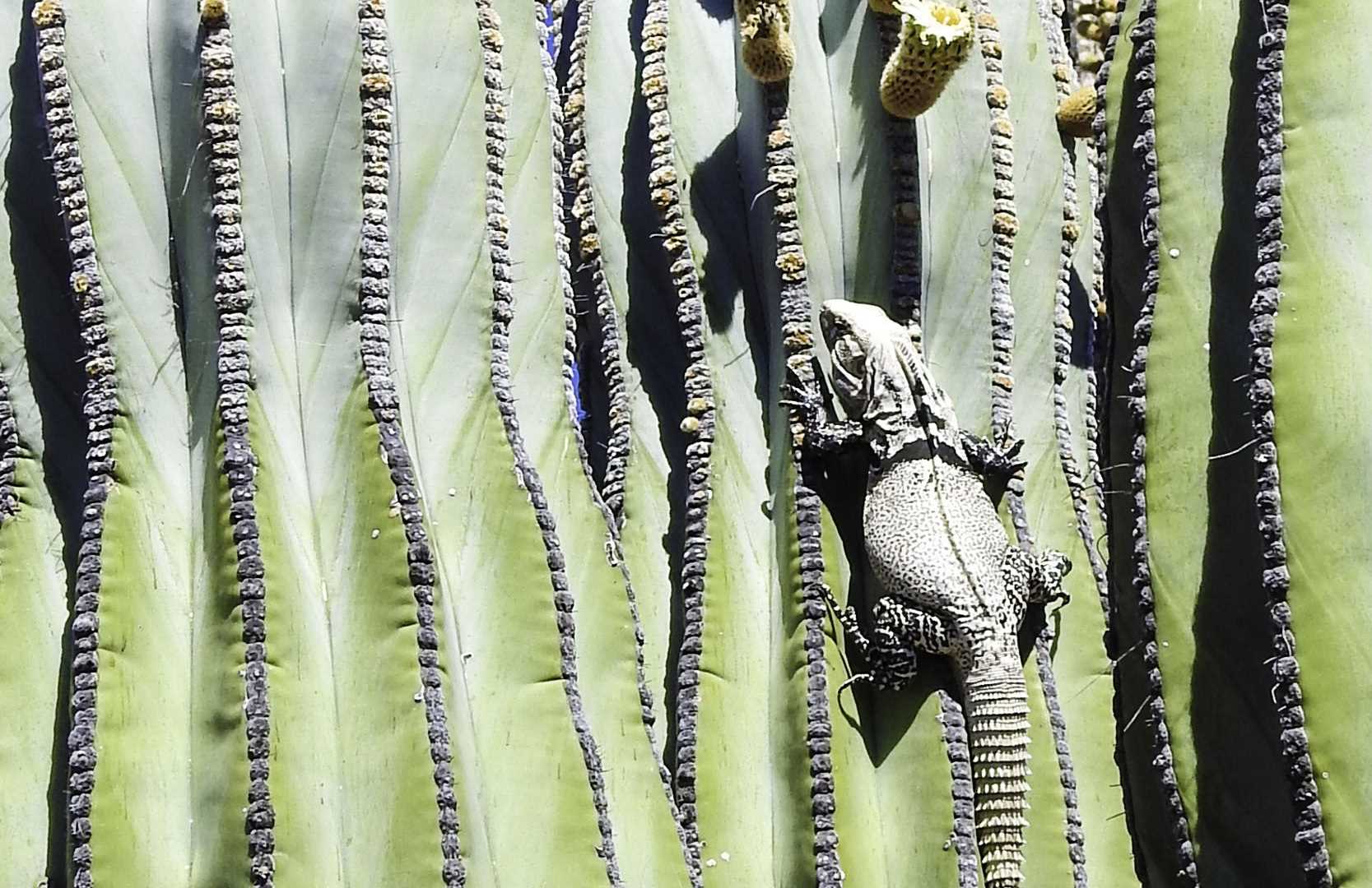 The morning was spent exploring Isla San Esteban, a small island once inhabited by the Seri people, a semi-nomadic indigenous group that subsisted on seafood and the many endemic lizards and snakes of the island. The most dedicated of us went over to the island before the sun came up, to maximize the golden hour as the light grew around us. At a more civilized hour all of us went back to the beach as the nesting endemic yellow-footed gulls watched from the rocks above. We respectfully played follow the leader, walking in a straight line to avoid their nests or mating plans. We made it to the arroyo and headed inland where we saw several impressive animals. The group favorites were the endemic and endangered piebald chuckwalla, the biggest of all five related chuckwalla species. We also enjoyed taking photos of spiny-tailed iguanas which tend to live in woodpecker holes on cacti.