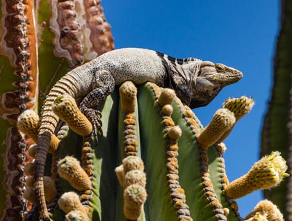 We weren’t on shore long, hiking up the sandy wash in Arroyo Limantor, when we spied our first spiny-tailed iguana sunning itself on a rock. This omnivorous lizard is known for climbing to the top of the towering cardón cactus to eat the fresh flowers that blossom at night, and sure enough, once the day warmed up we found many perched high above the ground. We also had good luck finding the more reclusive vegetarian chuckwallas hiding among the rocks not far from their caves and burrows.