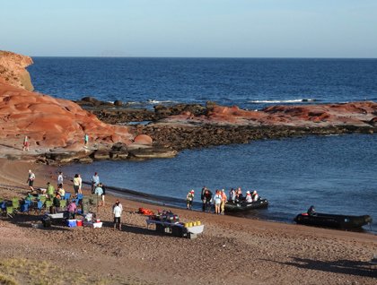 Later in the afternoon, the galley crew set up a delicious dinner at the base of the sandstone. The backdrop was filled by a series of silhouettes, each higher than the previous one, finally ending at the ridge of the peninsula. As the sun set, rays of light radiated out from the crest. The scene was so spectacular that photographers seemed to take hundreds of images, at least in total. Once the sunbeams were gone, firelight flickered in the faces of those gathered around the bonfire in a semicircle. Our expedition leader and one of the naturalists told stories and helped us understand the history of this great area. Stars peaked out from a partial overcast of thin clouds as our day ended.