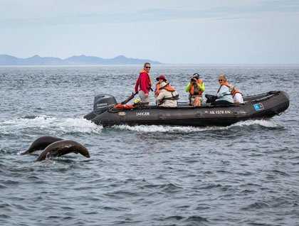 In the dawn light we launched our fleet of inflatable boats to explore the waters around Isla San Pedro Mártir, the most remote island in the Sea of Cortez. The morning was blessed with a warm breeze, and we enjoyed calm seas as we circled this precipitous island, marveling at its many denizens. Brown boobies and blue-footed boobies crisscrossed the air above us. Brown pelicans rested stately on the shoreline rocks, meticulously preening their feathers. Red-billed tropicbirds flew overhead occasionally, calling exuberantly with shrill voices as they swooped close to the rocky cliffs. The most amusing creatures we found were exuberant throngs of young California sea lions jumping, playing, and curiously peering at us from the sparkling waters around our boats.