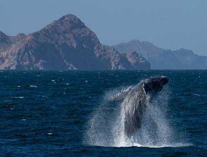 For the afternoon we were intending to head to the shores of Isla Carmen for Zodiac and kayaking options, but as we transited the rich waters of the Loreto Bay National Park, bottlenose and common dolphins were sighted, along with a humpback whale. To jump to the end of the story, we spent the next three hours in “dolphin and whale soup,” but the details are as rich as the seas. When an expedition ship encounters a group of thousands of dolphins, it is not only the wildlife, but also the experience and grace of the officers and expedition team that helped make the experience astounding. While we enjoyed a massive group of common dolphins, the bridge and naturalists kept track as we continued to close the distance between us and an active humpback whale. Flukes were raised high against the distant backdrop of the Sierra de la Gigante mountain range, the backbone of the Baja Peninsula. But then, another humpback was spotted, breaching over and over again to the east.