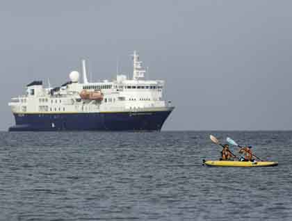 In the cool of the morning as the sun began to burn off the tropical haze, we jumped into the Zodiacs for an exploration of a pair of small islands: Bona and Estiva. These are important seabird breeding sites—a fact that was immediately obvious. Thousands of magnificent frigatebirds soared like kites in the sunrise breezes over the rocky summits of the islands, swirling, dipping, chasing and simply hanging in the air, suspended on their beautiful sharp wings, riding the winds like their nimble namesake sailing ships. At the same time more thousands of brown and blue-footed boobies poured off their roosting ledges, circled briefly and set out for their morning fishing excursions. As we approached the cliffs along the waterline of the small islands we soon had good views of these comical birds and their lovely azure feet.