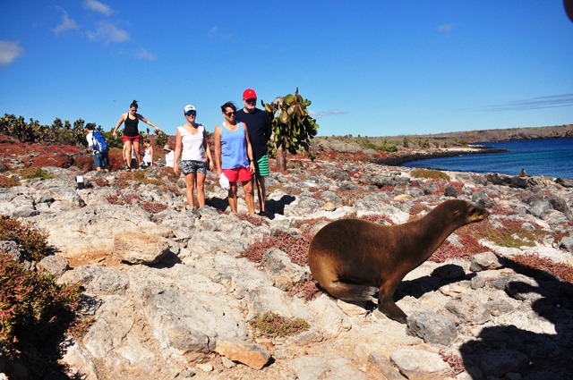 Plazas Island was named after a former Ecuadorian president; this small Santa Cruz satellite island holds a healthy population of land iguanas and prickly pears. Today we had a dry landing ready to take the 1.5 mile loop equipped with good walking shoes. We had close fun encounters with our ever-present friends the Galapagos sea lions. We climbed from shore smoothly to a cliff where seabirds like frigate birds, shearwaters and tropic birds take advantage of the updraft as they zoom above and in front of us. Today we were to see a male marine iguana courting a female land iguana. We’ve seen hybrids on this islands and is impressive to us see how it all begins.