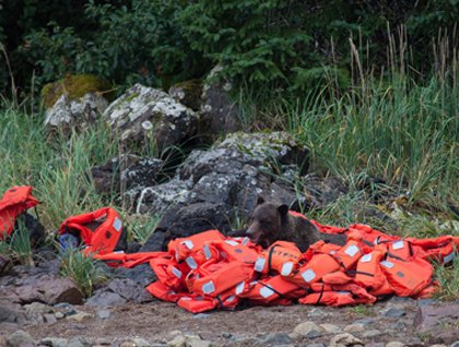 When we first arrived the bears were out of sight, probably up in the forest. Soon a report came in by radio: a bear was wandering our landing beach and sniffing around the life jackets. After a brief catnap and nibble in the jackets, it continued down the beach, into the forest, past our group, and into the water. Wonderful shots were taken of the bear fishing for salmon. Kayakers got great views from water level, and a second bear wandered into the stream to join the first.