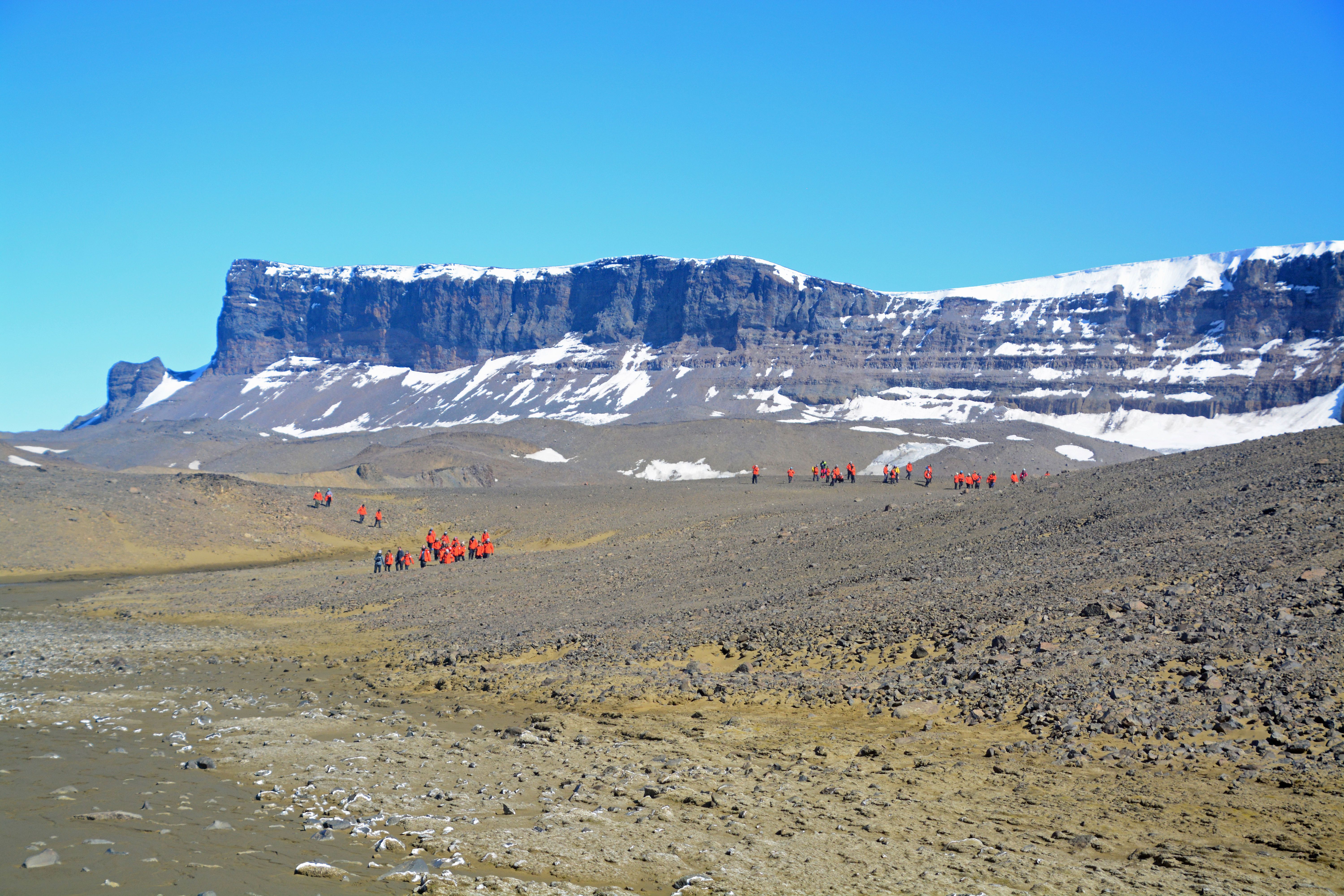 Our first landing of the voyage was on James Ross Island, part of the Antarctic Peninsula, in the Weddell Sea. Glaciers incised the island, attaching it to the peninsula by ice shelves until the mid-1990s. The island is composed of volcanic and sedimentary rock with fine glacial silt mixed in. Snow and ice cover the higher plateau areas.