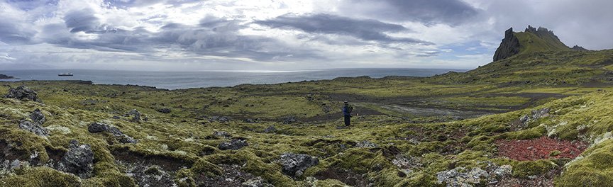 With all our foul weather gear and cameras well protected we head over in the trusty Zodiacs for the landing on a black sandy beach, comprised of volcanic materials. The gray skies show up the rich vegetation that covers the steep slopes of the southwestern part of the island. They look resplendent in all their finery. The coastline is made up of various basalts, close to the waters we can discern columnar basalt and then further up a jumbled mass of dark rock, at times looking tortured. As we approach the landing in very stiff winds we are greeted with a very enthusiastic, “Welcome to Jan Mayen!” We then link up with the staff who will lead the various walks. Along the way we have opportunities to learn more about the geology of this place and pause along the way to enjoy the plants, many in full bloom. The stay ashore ends with a visit to the little museum, post office, and shop, where we are able to purchase some T-shirts.