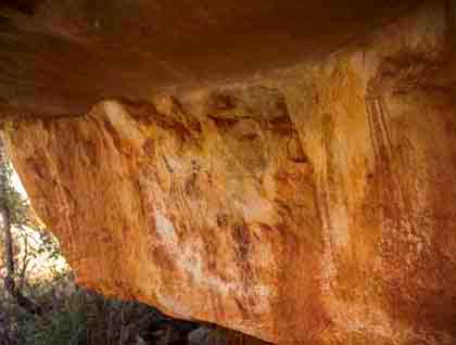 Our morning explorations took us to Jar Island to visit several wonderful galleries of the style of rock art called Bradshaw or Gwion Gwion. We hiked a short distance inland on an easy trail and then threaded our way among sets of huge boulders, clambering over smaller rocks and roots to arrive at shady openings where ancient figures of men and animals surrounded us.  Gwion Gwion art evolved considerably over the long period during which it was created and we saw many beautiful examples of several different styles, including the oldest “tassled” figures, the “clothes-peg” figures – named for the resemblance of the body forms to old wooden clothes pegs – and more recent illustrations of fish, crabs, echidnas and other animals that are perhaps best described as menus. Cristiana, Mark and Brent described their forms to us, pointing out many that were hidden in the shadows or under overhanging rocks and encouraging us to speculate on their significance. No one today fully understands Gwion Gwion art, but we felt a strong connection to the lives of the people who lived here and touched these very boulders so long ago, leaving beautiful and mysterious stories for us to contemplate.