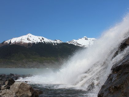 After the scenic tram ride back down to Juneau’s port, the guests boarded buses and took off to Mendenhall Glacier. The glacier used to be enormous—and has begun melting in relatively recent years. This landscape used to be covered in ice, the area which now houses the museum has only been exposed since 1950. This is important to note when surveying the landscape, as these plants have only had this small amount of time to establish a community on this barren rock. Many people chose to take the mile-long hike to an astounding waterfall, which seemed to endlessly gush off the nearest mountain’s slope.