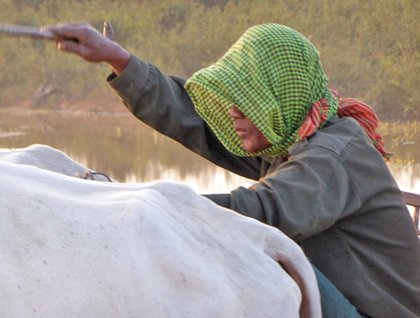 The orange glow of a full moon was reflected upon the wet fields near Kampong Tralach on the banks of the Tonle Sap River. Pinpoints of light moved towards us like fireflies flitting along the dark banks. Above the croaking of frogs, soft voices could be heard and if one listened closely the sound of hooves plodding on an earthen road was like the heartbeat of the earth. The ruby glow of the sun had barely appeared above the horizon before we found ourselves ensconced in the back of an ox cart bouncing between rice and lotus fields where egrets moved elegantly. Royalty could not expect a more enthusiastic welcome than we received at the local school where all the children, morning and afternoon students and night ones as well, crowded four to a desk to say hello and demonstrate their English skills.