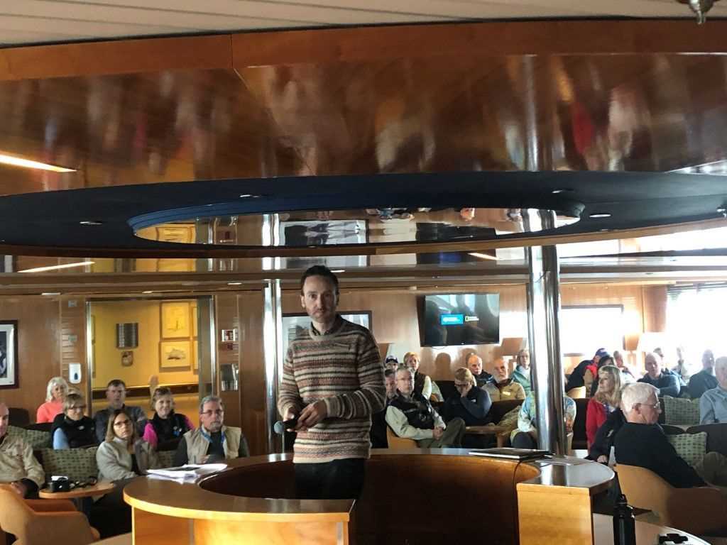 Our great ship, National Geographic Explorer, meandered her way into the beauty of one of Greenland’s most picturesque fjords, heading to Kangaamiut. Our morning was filled with presentations by Emmett Clarkin giving a presentation on “The Motion of the Ocean,” followed by Karen Copeland discussing “Feeding the North.” In the afternoon, guests were given the opportunity to cruise as close as possible to the calving ice of a very active glacier. The cracks and growls and roars and howls were incredible as ice fell into the ocean, delighting guests and staff alike.
