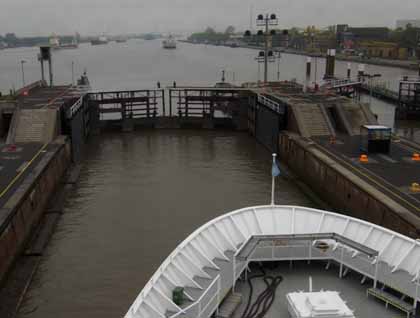 Around breakfast time we left the North Sea and entered the River Elbe. From here, we entered the canal itself, and began the transit of 61 miles. We were able to go into the smaller lock, saving quite a bit of time as there were many larger container ships and bulk carriers that were lined up to use the bigger lock. Throughout the day, we continued on, sailing under numerous large bridges and passing everything from a kayak, to a sailboat, to massive container ships.