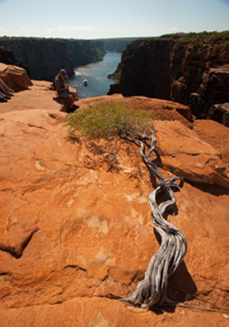An early morning start took many to the top of the falls via a substantial rock scramble starting from river bottom. After 20 minutes and a fair amount of sweat we were at the top of the plateau with another 10 minute walk before the view we had been waiting for. Peering down the length of the King George River from the top of the falls was one of the highlights of the trip as freshwater disappeared beneath our feet and soaked into our skin during our ensuing dip into the headwaters of the falls.