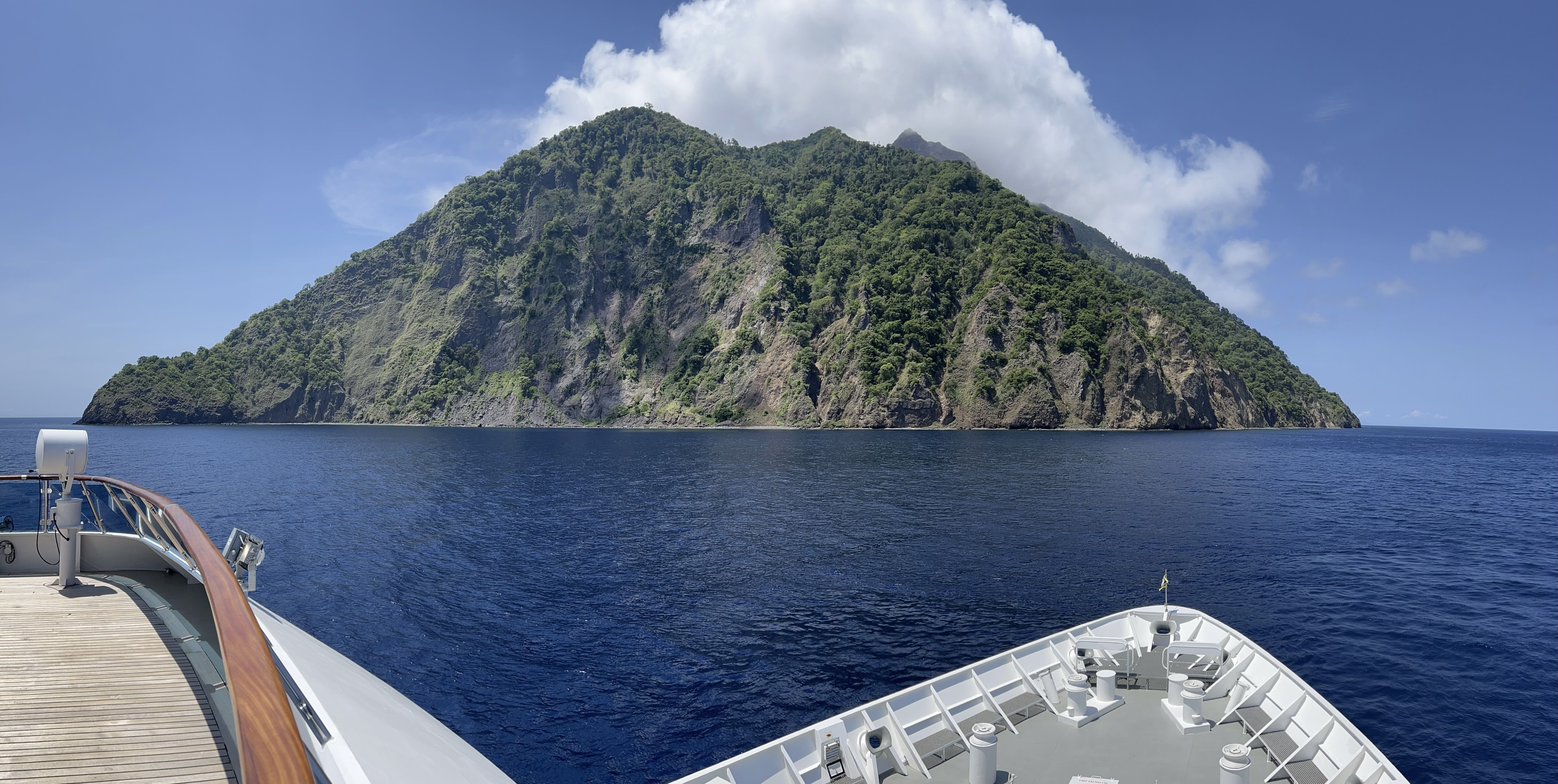 Today we added a stop on our way to Komodo. At first light, we set eyes on the perfect cone and ash plume of the Batutara Volcano that makes up Pulau Komba Island. As we got closer and closer, we could even smell the sulfur that is constantly emitted by this impressive, active volcano. As soon as we were in position, we launched Zodiacs to find the best spots for snorkeling and diving. We expected to do our water activities from the Zodiacs, but we found a beautiful black sand beach in the early morning light. What a privilege to be able to set foot on this tiny, remote island! The reef was just spectacular with crystal-clear waters, many different types of colorful soft coral, and a myriad of fish. What a perfect snorkel spot! After last night’s recap and Brett’s presentation about how we share an unexpected amount of DNA with sea squirts, we kept our eyes peeled for a good look at and photos of our distant relatives. As a bonus, many of us were able to see a big octopus stretching out over the coral. Underwater, the flanks of Batutara Volcano drop off to 700 m. This made for a spectacular wall dive. Divers enjoyed great visibility of the diverse coral with beautiful sea fans and rugged underwater canyons bustling with marine life. For those who preferred to stay dry during the morning, a Zodiac cruise around the volcano was offered. With the guidance of geologist John, this was a perfect on-site volcanology lesson with close views of the sulfur cone and the towering plumes. We were able to witness the formation of a scree field as it happened. As small rocks spewed out of the volcanic cone and landed on the steep, rocky slope, some of them were still fuming. Back on board, we were treated to a Frühschoppen. The hotel department set up a grill with sausages, sauerkraut, and fresh brezels. To the tunes of Bavarian music, we sailed towards Komodo with Pulau Komba slowly disappearing on the horizon behind us. Photography was the theme of the afternoon. Photo instructor Lisa organized a photo analysis in the main lounge. Everyone had the chance to submit their favorite images and discuss them with the fellow travelers, Lisa, and National Geographic photographer Chris Rainier. So many great photos were submitted that the lively discussion was extended by half an hour. And tomorrow, there is more to come. After recap and a briefing by expedition leader Alex regarding our visit to Komodo Island, we are all excited for tomorrow’s adventure.