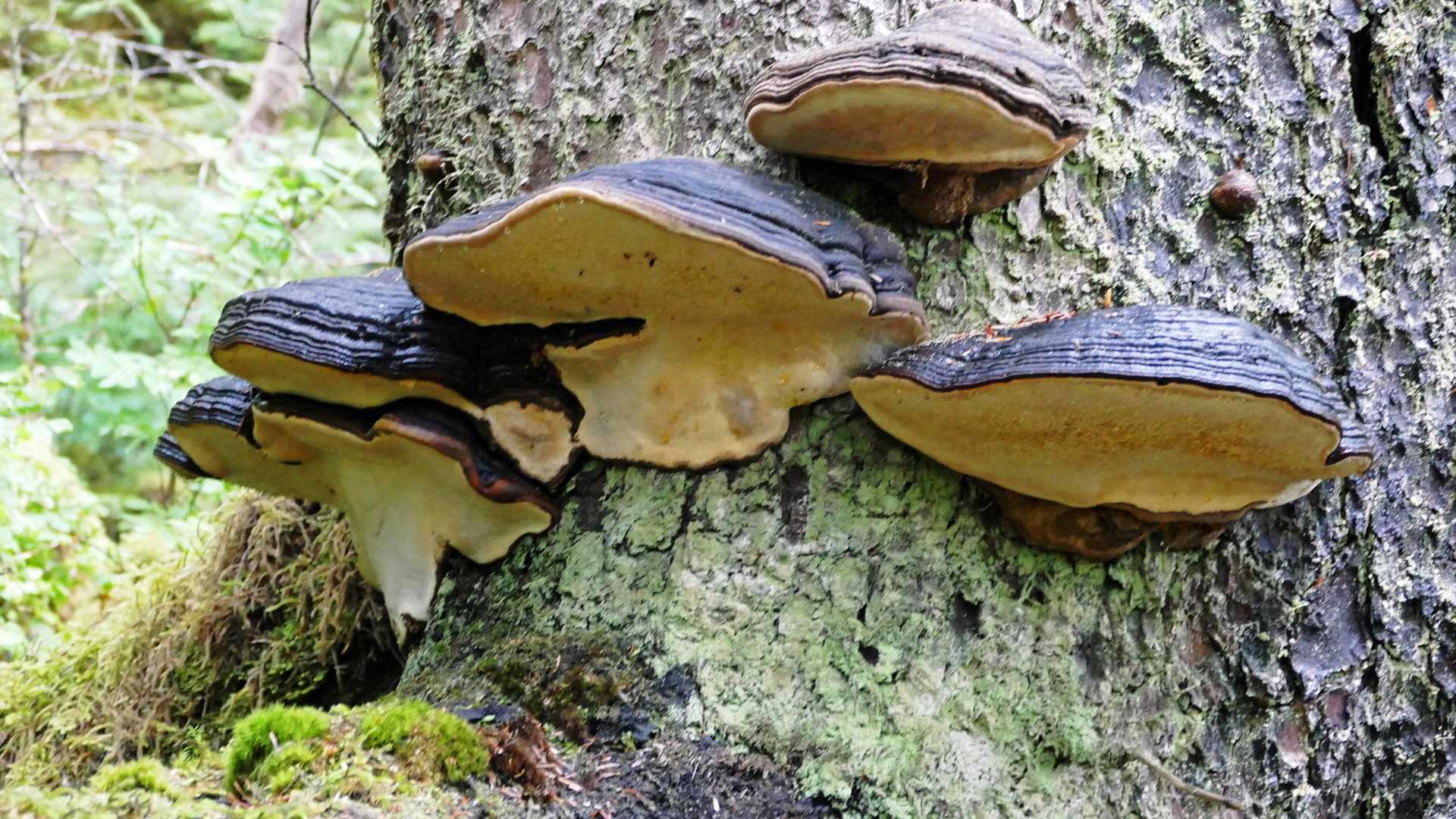 The forest was a tangle of fallen moss-covered trees, patches of boot sucking mud, Sitka spruce and western hemlock of all ages, and mosses growing on mosses covered in lichens. Many decomposing giants were studded with artist conk—a hard fibrous shelf fungus that breaks down dead wood and helps to recycle nutrients. The white underside marks easily and artists sometimes use it as a canvas.
