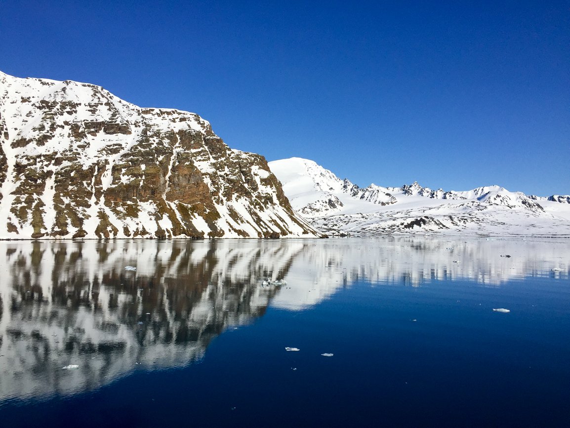 The National Geographic Explorer made her way into the Krossfjorden area on the northwestern edge of Spitsbergen, and specifically Signehamna. The day was clear, calm and surprisingly warm, with temperatures reaching 50°F. The lack of winds made for some beautiful reflections in the channel. The still air allowed us all to hear the calls of Arctic Terns, the purring and churring of little auks as they flew across the bow in small flocks, and the deep rumbles of common eiders. After the guests had filled their morning with hikes, kayaking and Zodiac cruises in the area, the ship made her way up to the Lillehøøkbreen glacier. This glacier is famous for being an active glacier, which means it calves chunks of ice from its face on a regular basis. The groans and cracks from the glacier were bouncing around the end of the fjord, triggering oohs and aahs from the guests, who were eager to see a calving event.