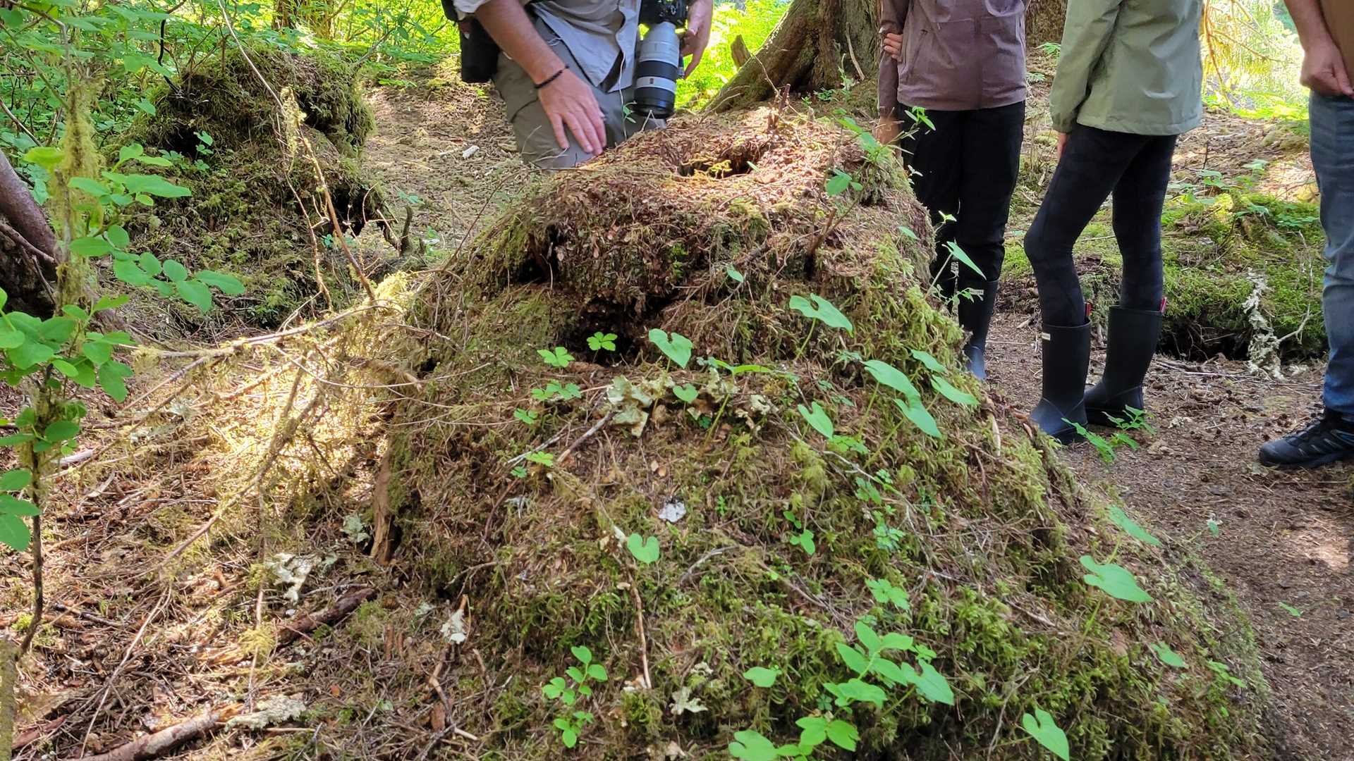 While scoping the coastline in the afternoon, a brown bear (Ursus arctos) was spotted! Shaded by overhanging trees, the brown bear was foraging for some delectable treats, but not to be upstaged by the humpback from earlier, the bear started to strut out into the sun. Its honey-colored face was highlighted against the dark shaggy hump on its back, and with the help of some binoculars we made out its facial features.