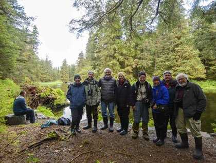 The day began with a humpback whale and chilly overcast morning, which in typical fashion for this trip lifted into blue skies.  The whale circled in front of the bow, feeding and diving as we slowly made our way towards our anchorage.  After breakfast we zipped to shore.  Some folks paddled out in kayaks, exploring the mouth of a stream and admiring the pink-purple-gold shooting stars along the shoreline.  Goldeneyes and blue-winged teals floated alongside the kayaks, and hikers enjoyed photo ops of the colorful kayaks.  The long distance hikers hit the trail to trek out to the banks of Lake Eva and stand among giant old growth sitka spruce.  Other walks wandered the trail admiring and photographing spring flowers, lichens and moss, squirrel middens, sapsuckers and slugs.  Bear scat speckled the trail and we had a taste of real brown bear country.
