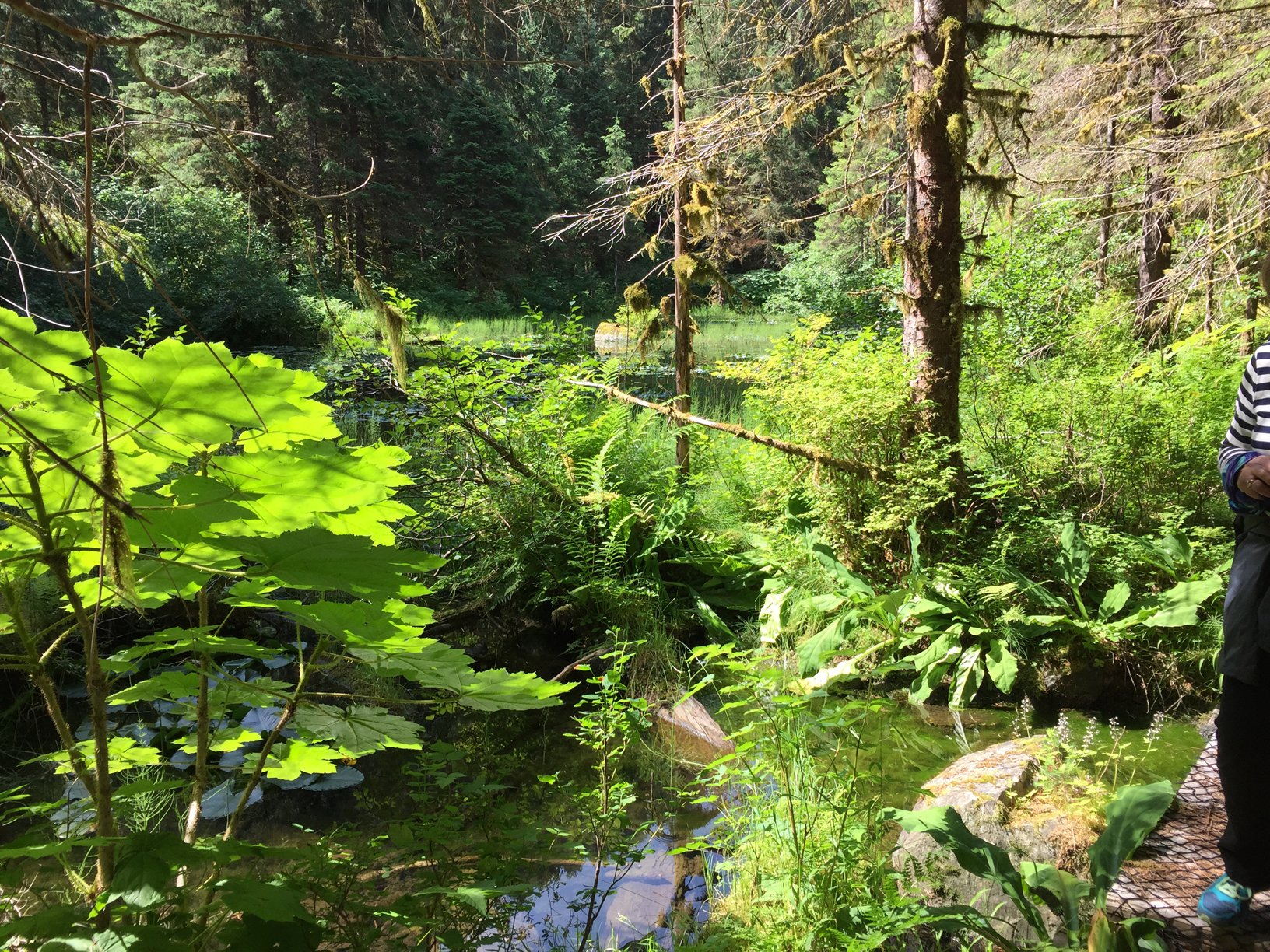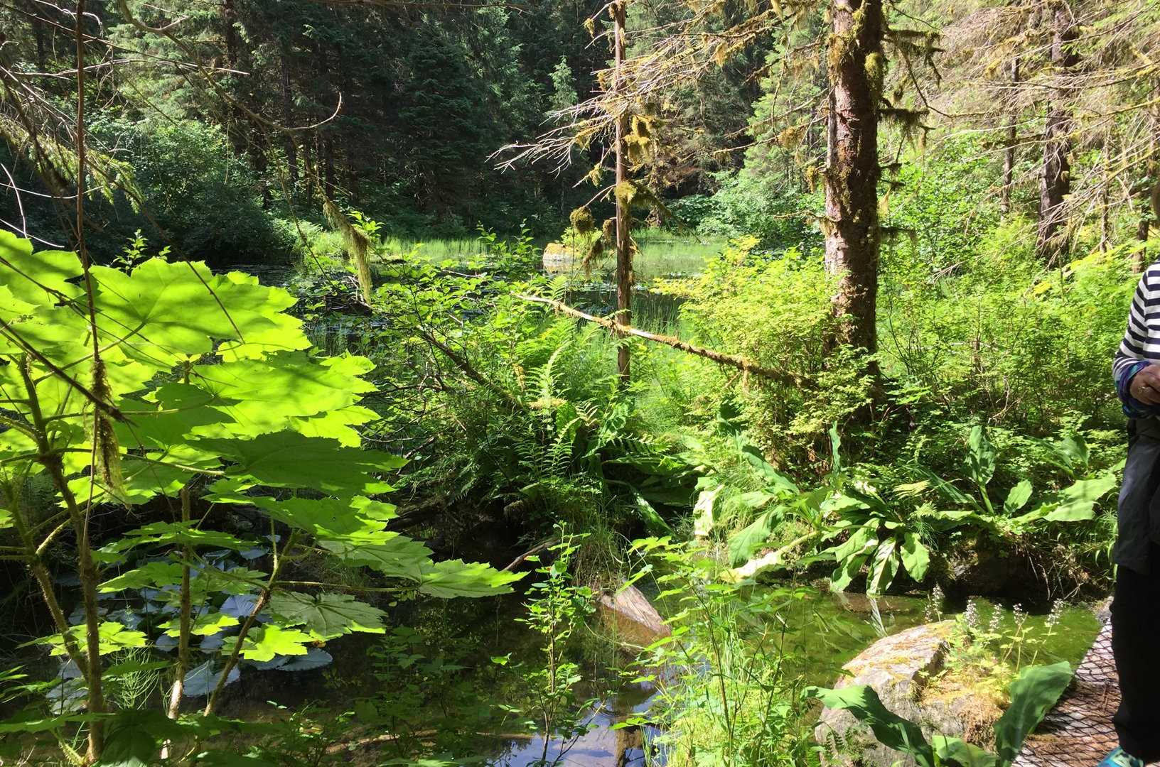 Another beautiful day dawned as we sailed south toward our morning anchorage in the quiet water off the northeast coast of Baranof Island. After morning stretch and breakfast, we boarded our expedition landing craft to begin our adventures on and off the island. Groups dividing into kayakers, hikers, and cruisers took advantage of a remarkable sunny day to explore the habitat of a rich salmon spawning stream and its environs. The long hikers reached the eastern edge of Lake Eva where a small stand of old growth forest remains near the water’s edge. Enormous Sitka spruce trees nearly ten feet in diameter and over 500 years old remind us of how the Tongass National Forest looked without the scars of modern clear-cut logging. Along the way we saw energetic red squirrels eating and storing the seeds of the spruce. Piles of seed casings litter the base of the trees. A belted kingfisher flew past and roosted on the branch of a western hemlock tree holding a small fish in its beak. We passed fishermen carrying a large sockeye salmon caught in the stream and many fish were seen jumping from the water, no doubt feeding on insects flying near the surface.