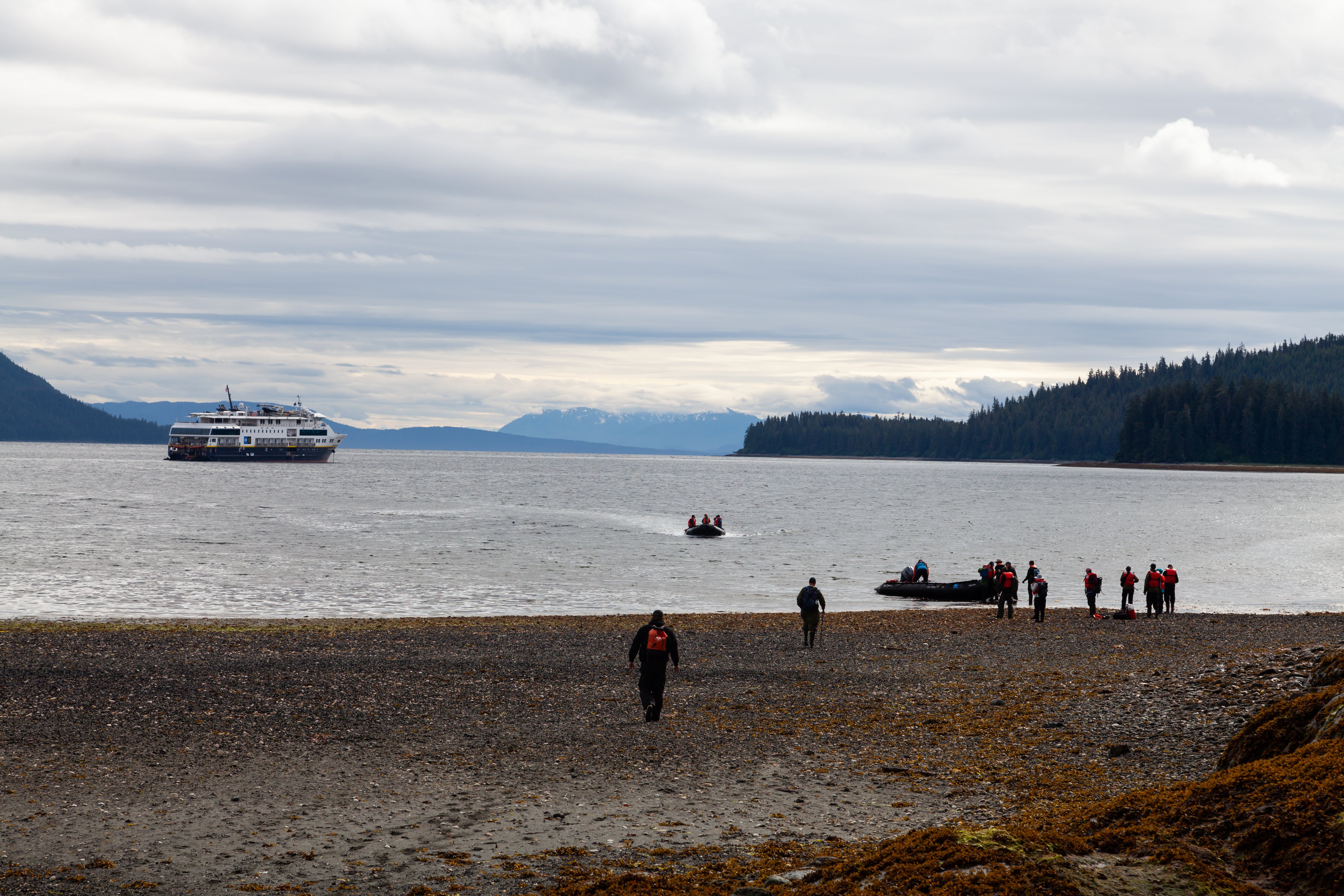 Today we woke up in Hanus Bay to overcast skies with a bit of sunshine on the mountains of Baranof island. As our hard-working deck crew lowered the inflatable boats, we had a delicious breakfast prepared by our talented galley team. We disembarked the vessel from the fantail and headed to shore, with the Zodiac drivers taking extra care to land the boats on a very low tide.