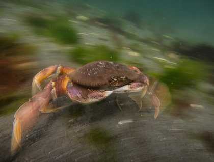 The flat-topped reef stepped down in increments of 10-20 feet, small plateaus connected by vertical walls just perfect for filming and photographing. We swam along and quickly encountered a very large Puget Sound king crab eating an excavated cockle it had recently crushed with a powerful claw. A well-manicured crevice was a sure sign of the giant Pacific octopus. Unfazed by our noisy presence, the huge octopus peered out with a watchful eye but never came out to investigate the aliens lurking at its threshold. Sadly, our air supply is limited so we began the slow meander up the wall, back to shallower waters. Along the way we spotted the very unusual grunt sculpin and were even visited briefly by a large Steller sea lion.