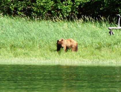 Groups headed off into the woods while others paddled around the small bay watching and listening to eagles and ravens.  All of a sudden, the call came out that a brown bear was seen on one of the small islands.  The bear was small and probably only 4 years old.  He or she was busy munching on grass and waiting patiently for the salmon to make their way from the Pacific Ocean through the fjords and water ways searching for their natal stream.  The kayakers had great views of the bear as he made his way along the grassy shore. The walkers and hikers enjoyed the trail and the many wildflowers that are out right now.  At the end of the walk there were even some swimmers enjoying the sunny beach.