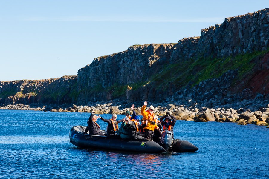 After a late night ashore on Grimsey, the heels were dragging this morning. So we enjoyed a slight sleep in, and with fully caffeinated bodies headed out for a Zodiac cruise of the cliffs and coastal zone of part of the Langanes Peninsula. This isolated eastern promontory was breezy and at times a little foggy, but in the sun and out of the wind we enjoyed idyllic conditions.
