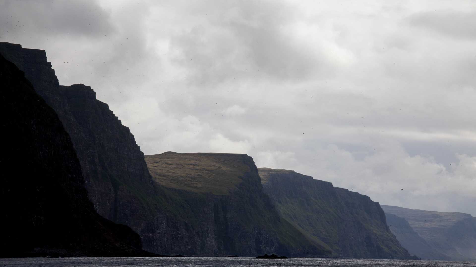 National Geographic Orion arrived at Latrabjarg Cliffs during breakfast. These spectacularly sheer cliffs on the westernmost side of Iceland are home to about 75% of Iceland’s razorbill population as well as thousands of guillemots, kittiwakes, ravens, and skuas. Razorbills are a member of the Auk family, perhaps known for the great auk. The great auk was a large (~4’ tall) flightless bird with a strong resemblance to the southern hemisphere’s penguin. Great auks were captured as an easy food source for early settlers, and the species was extinct by 1900. The ship deployed Zodiacs for a fantastic cruise, allowing guests a close-up view of the striking basalt walls, nesting sea birds, and the ability to peer into the chilly blue clear sea.