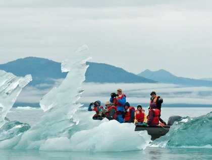 In nearby LeConte Bay, art deco ice reminiscent of Lalique’s art glass drew us out into the expedition landing craft for a stunning sculpture tour around blue icebergs grounded on terminal moraine. Light dancing through interior air bubbles absorbs the red part of the spectrum and our eyes see blue, azure, turquoise, sapphire, and cerulean. Draped in low cloud, the steep fjord walls covered with dark spruce trees added drama to the scene. Some of us landed in the intertidal zone and explored the icy bits on foot as well.