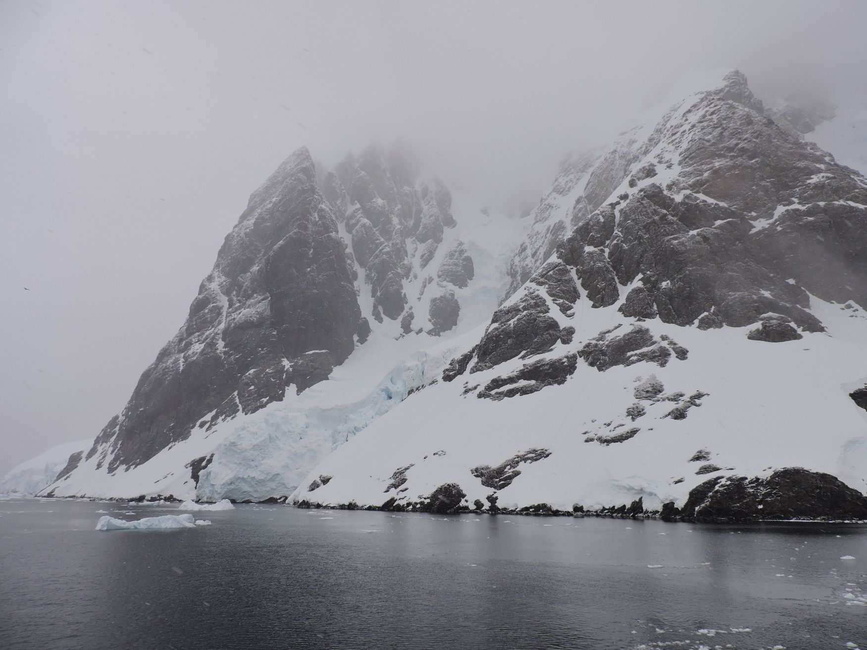 Early this morning, we entered the north entrance to the Lemaire Channel. It was named by Adrian de Gerlache in 1898 in honor of the famous Belgian explorer Charles Lemaire who worked in the Congo. Some would say, including many of the staff members, that this is the most beautiful stretch of water in the Antarctic Peninsula. Located between the peninsular mainland and Booth Island, the channel measures about seven miles in length by about one mile wide. It was formed by a geological fault that has been scraped out by glacial action, and the steep mountains on either side (igneous and metamorphic rocks to port and intrusive igneous rocks to starboard) presented wonderful displays of both geology and glaciology. It was moderately choked with ice, including some nice icebergs, and the low cloud cover and light snow made it even a bit eerie.