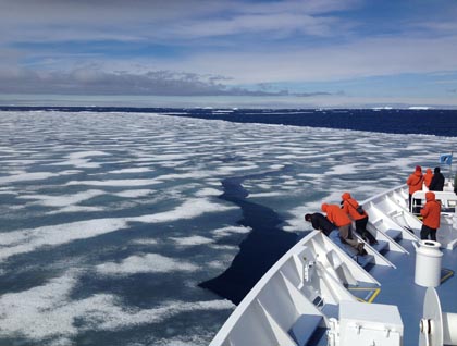 The Zodiac adventurers had the fun of going through brash ice and around the island. Several humpback whales were feeding among the ice. Near the shore, one berg had five crabeater seals hauled out onto it. By the time we returned to the ship the atmosphere had turned to gray on gray—gray clouds, gray fog, and light mist all hanging in the air. Our awaiting home, the National Geographic Explorer was still plenty visible and a wonderful warm sight to see as the only color in the landscape.