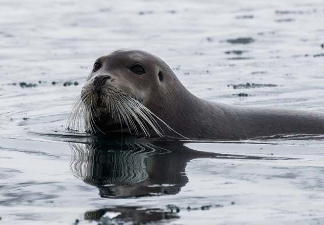 Today we spent our time in Leifdefjorden on the island of Spitsbergen as we began to make our way west from Nordaustlandet. The terrain is very different here—dominated by 380-million-year-old Devonian rocks very similar to the Old Red Sandstone of Britain and Ireland, giving a very distinctive dark-red color to the landscape. We began the morning with Zodiac cruises in front of Monacobreen, a large and spectacular glacier that empties into Leifdefjorden. The glacier has retreated markedly since the first time Lindblad Expeditions ships visited here in 1987 but remains very beautiful. As we cruised along the edge of the brash ice and into the first-year pancake ice in front of the glacier, we were welcomed by several young bearded seals who seemed to be very curious about us.